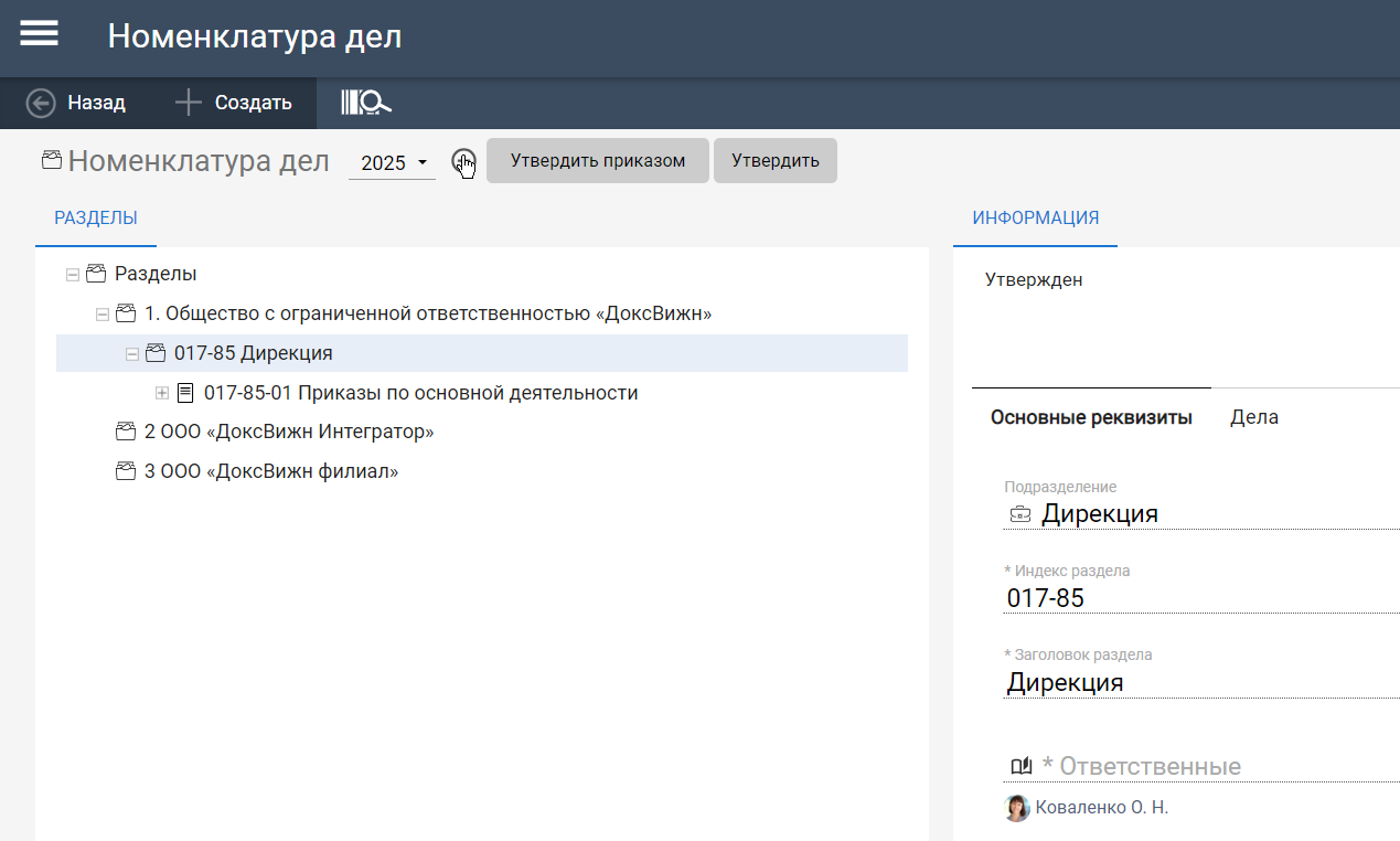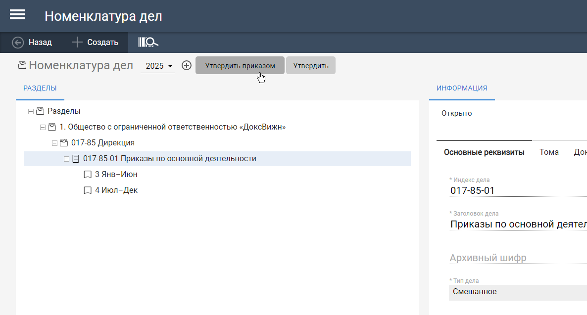 Утверждение номенклатуры дел приказом. После формирования номенклатуры на предстоящий год пользователь нажимает кнопку «Утвердить приказом», и система сформирует карточку приказа, которую можно отправить на согласование и подписание. Подробнее о новой функции можно узнать в документации.