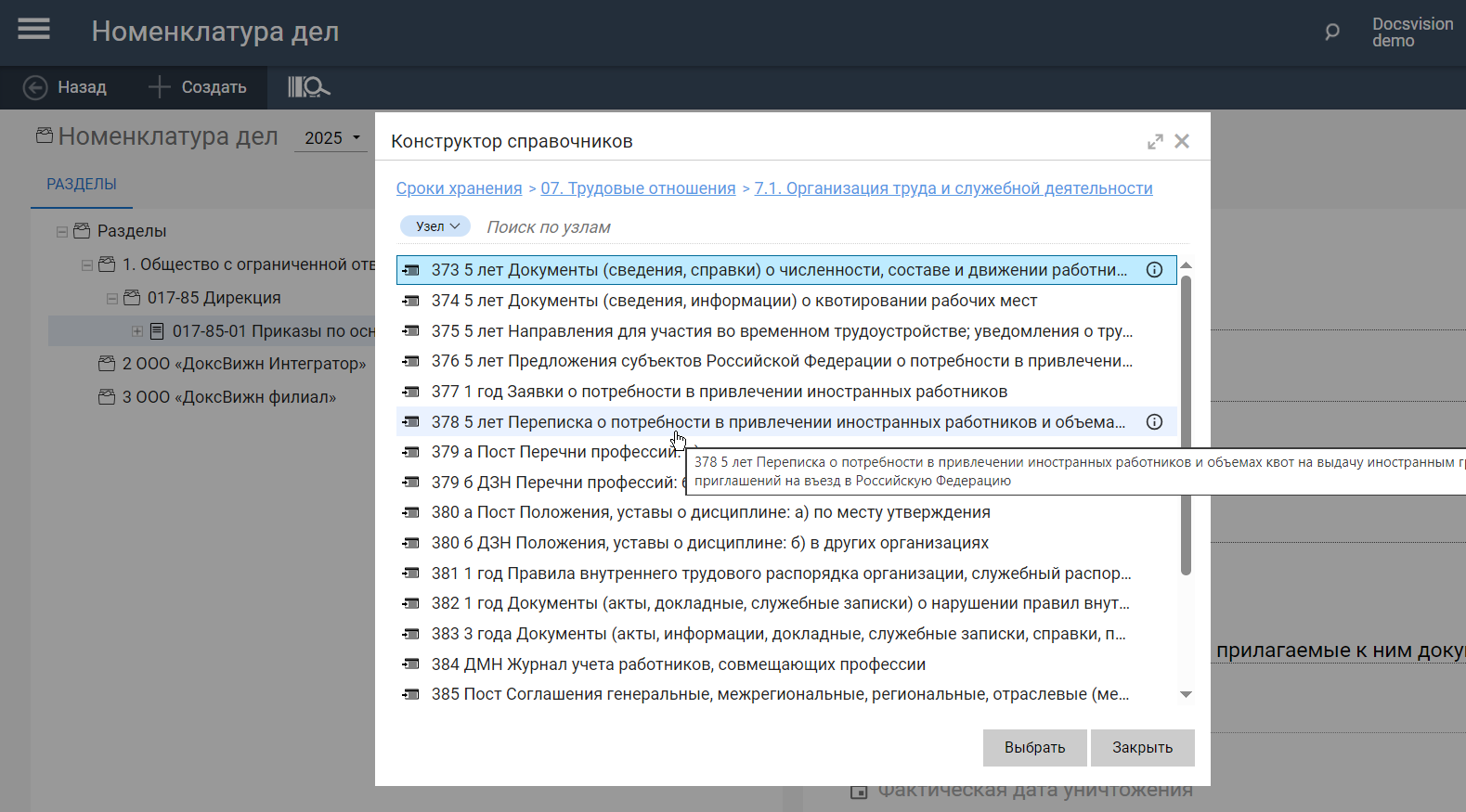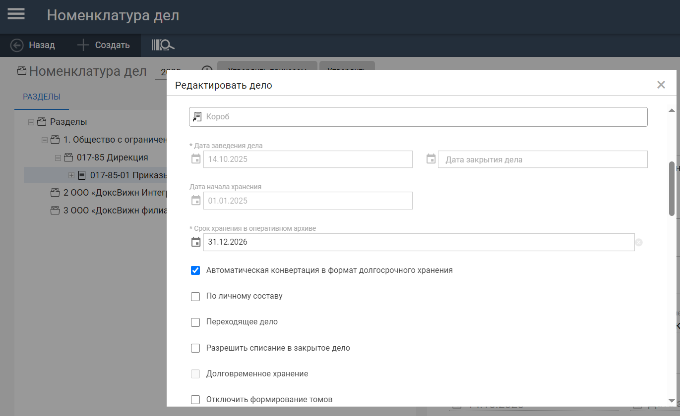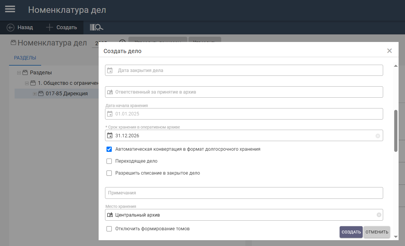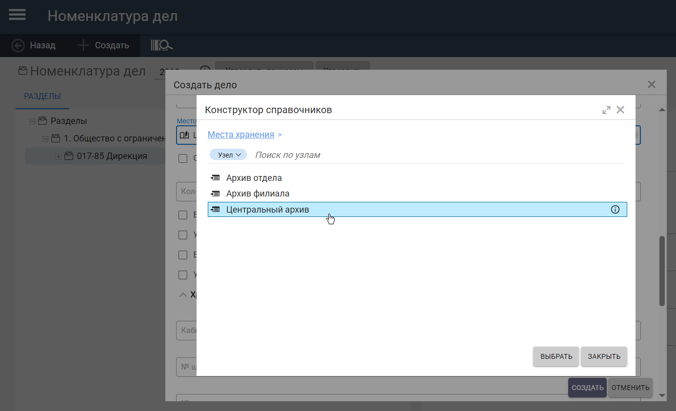 Добавлены новые справочники «Места хранения» и «Сроки хранения», которые можно заполнить и при создании дел в номенклатуре выбирать значения из них.