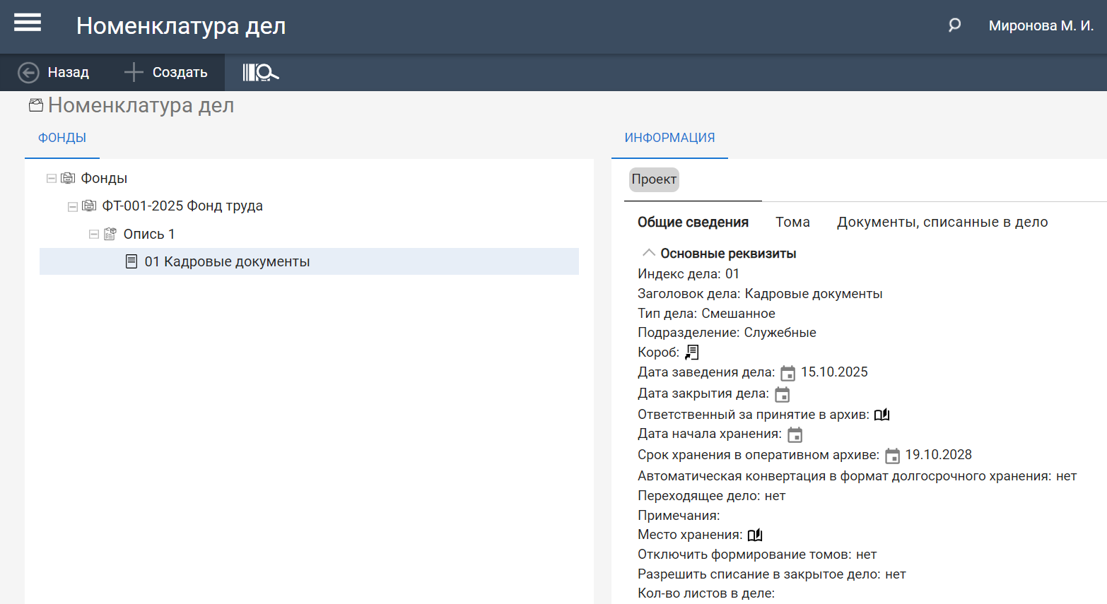 Для работы с номенклатурой дел появилось дополнительное рабочее место архивиста. Номенклатура дел в нём отображается в разрезе фондов, описей, дел и томов. Подробнее можно узнать в документации.