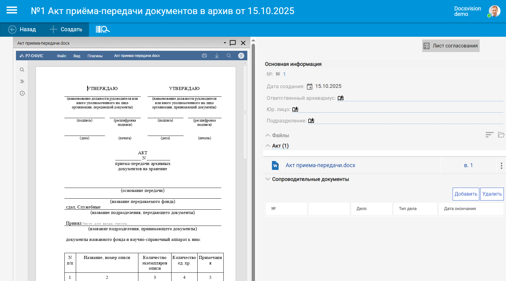 Модуль позволяет автоматически формировать акты приёма-передачи дел в архив по каждому подразделению, в котором были найдены подходящие для передачи дела. Созданные акты можно отправить на согласование ответственным сотрудникам от соответствующих подразделений. Далее архивист подписывает акты и осуществляет приемку дел в архив на долговременное хранение. Параллельно с этим модуль автоматически конвертирует принятые документы в карточки вида «Архивный документ» и упаковывает все файлы, приложенные к документам, и связанные с ними электронные подписи в контейнеры долговременного хранения в формате ZIP-архива.