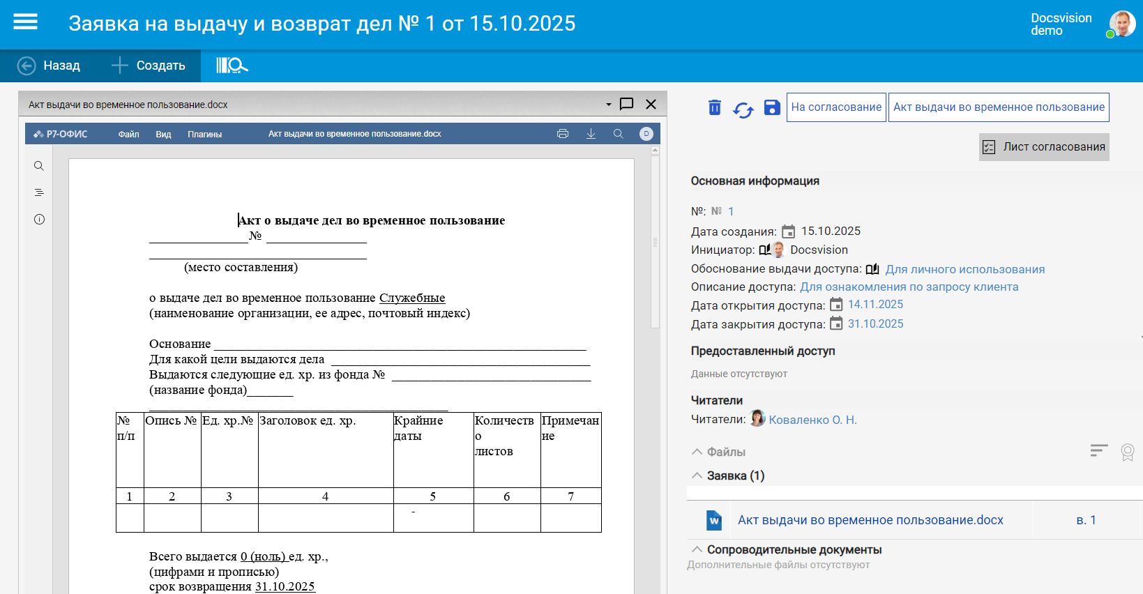 Модуль позволяет формировать заявки на выдачу и возврат дел из долговременного архива. В карточке «Заявка на выдачу и возврат дел» необходимо заполнить обоснование для выдачи доступа и ряд других реквизитов, после чего отправить её на согласование.