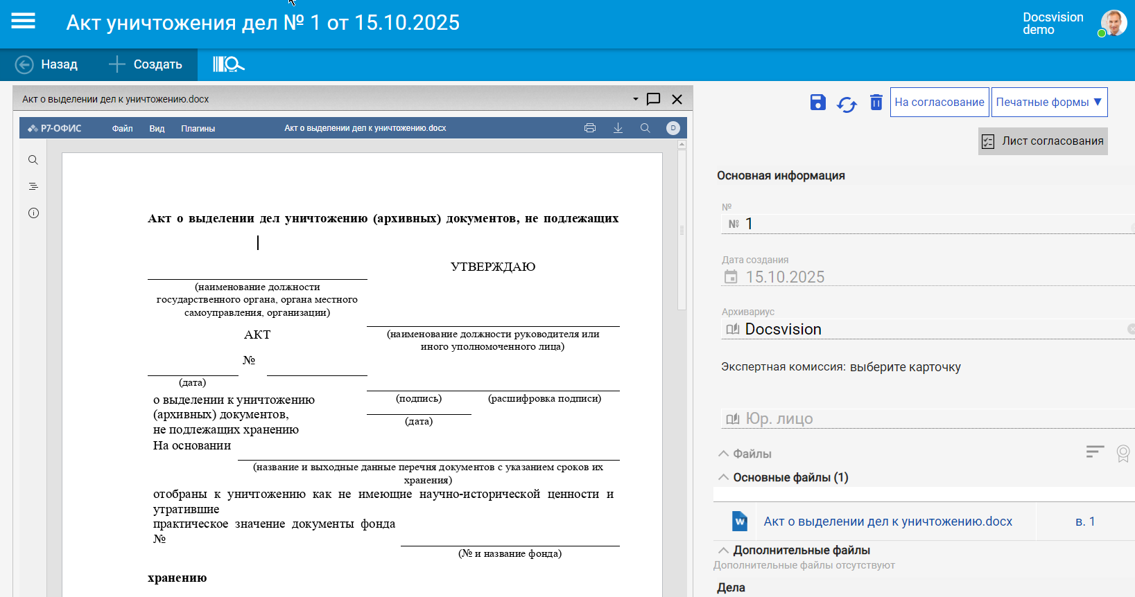 Модуль автоматически проверяет все дела на предмет истекших сроков хранения. Если такие дела есть, то по ним автоматически формируются акты уничтожения. Дополнительно может быть подключено согласование сформированных актов с экспертной комиссией.