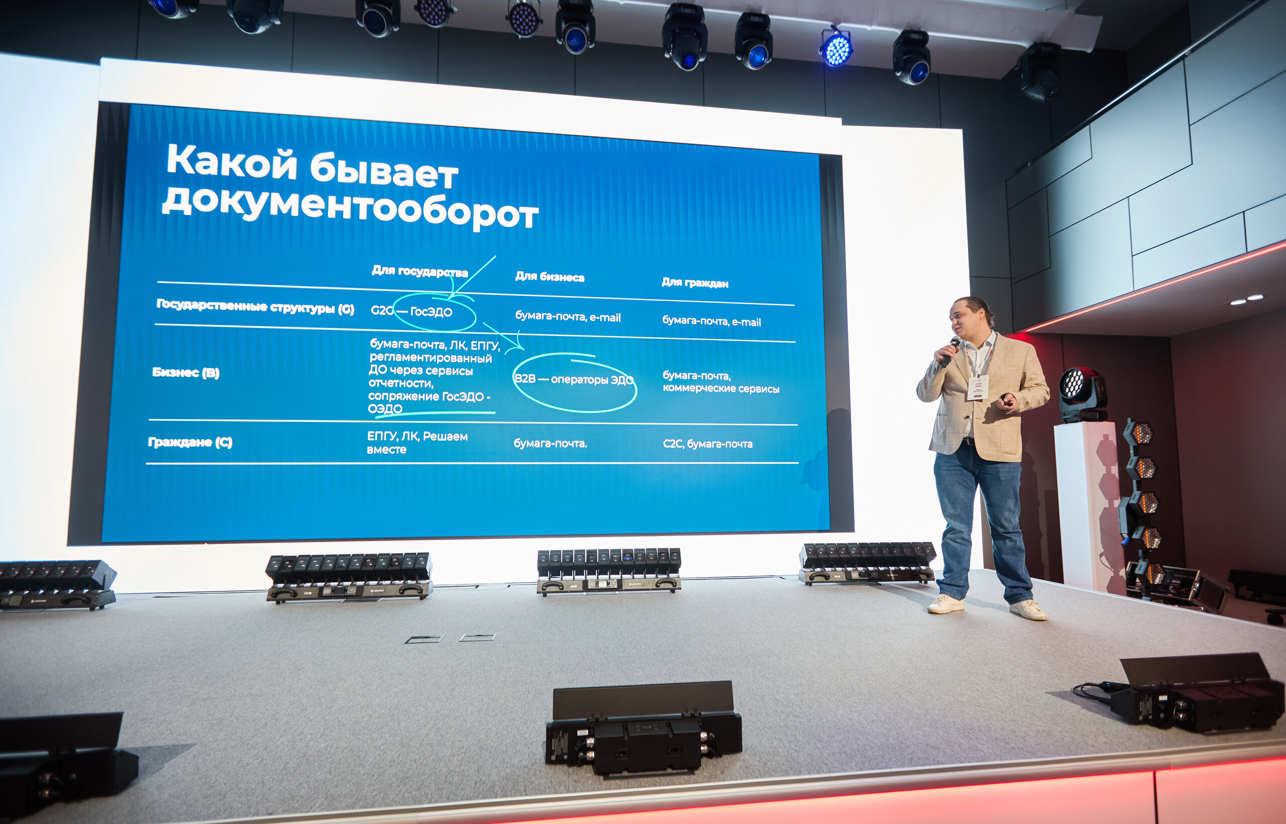 Доклад «Новые возможности ЭДО между госорганами и коммерческими компаниями» представил менеджер проектов СКБ Контур Иван Вятчинов. В своём выступлении он рассказал о развитии обмена с коммерческими организациями через платформу ГосЭДО.