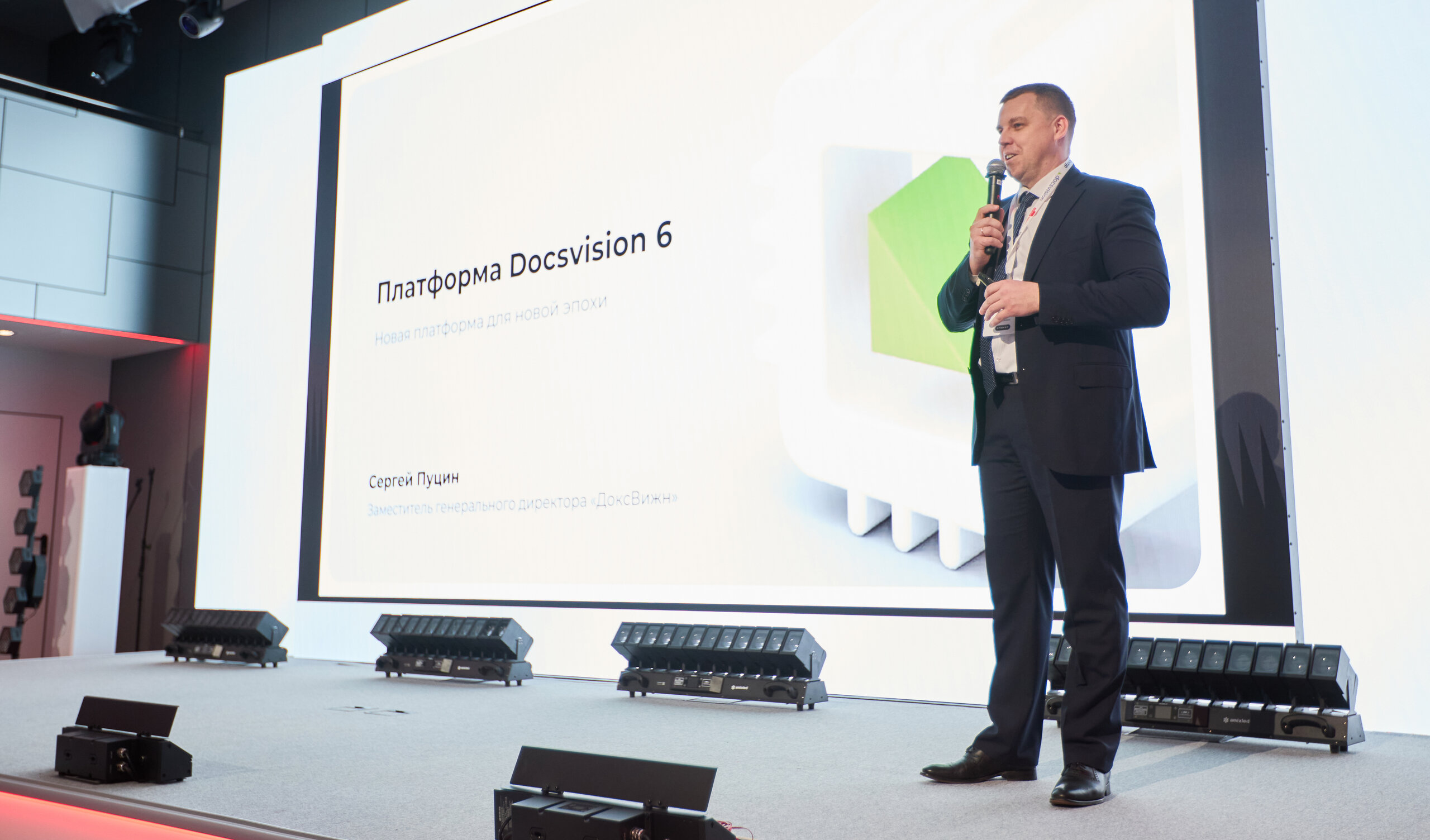 Деловую часть программы завершило выступление Сергея Пуцина, посвящённое Docsvision 6 – новой версии платформы, которую компания «ДоксВижн» представила в апреле 2026 года. В качестве основных преимуществ новой версии он выделил: кросс-платформенный сервер, позволяющий разворачивать Docsvision на российских ОС на базе Linux и на Windows, встроенные функции искусственного интеллекта, широкий выбор low-code конструкторов и большой портфель специализированных решений (СЭД, КЭДО, СХЭД, CLM и другие).