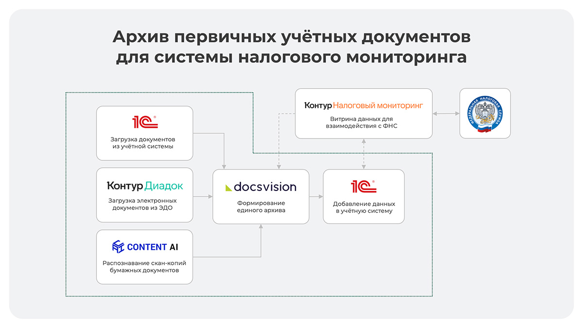 Витрина данных и интеграция с АИС «Налог-3», отвечающие за непосредственное взаимодействие с ФНС, реализованы на основе сервиса Контур.Налоговый мониторинг. Сервис предоставляет инспектору доступ к налоговым декларациям предприятия, данные которых передаются из 1С, и к первичным учётным документам, которые загружаются из СХЭД на Docsvision.