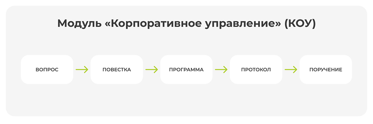 Модуль КОУ охватывает полный цикл подготовки и проведения заседаний: от инициирования и согласования вопросов, формирования повесток и программ — до проведения очных и заочных голосований, оформления протоколов и контроля исполнения поручений.