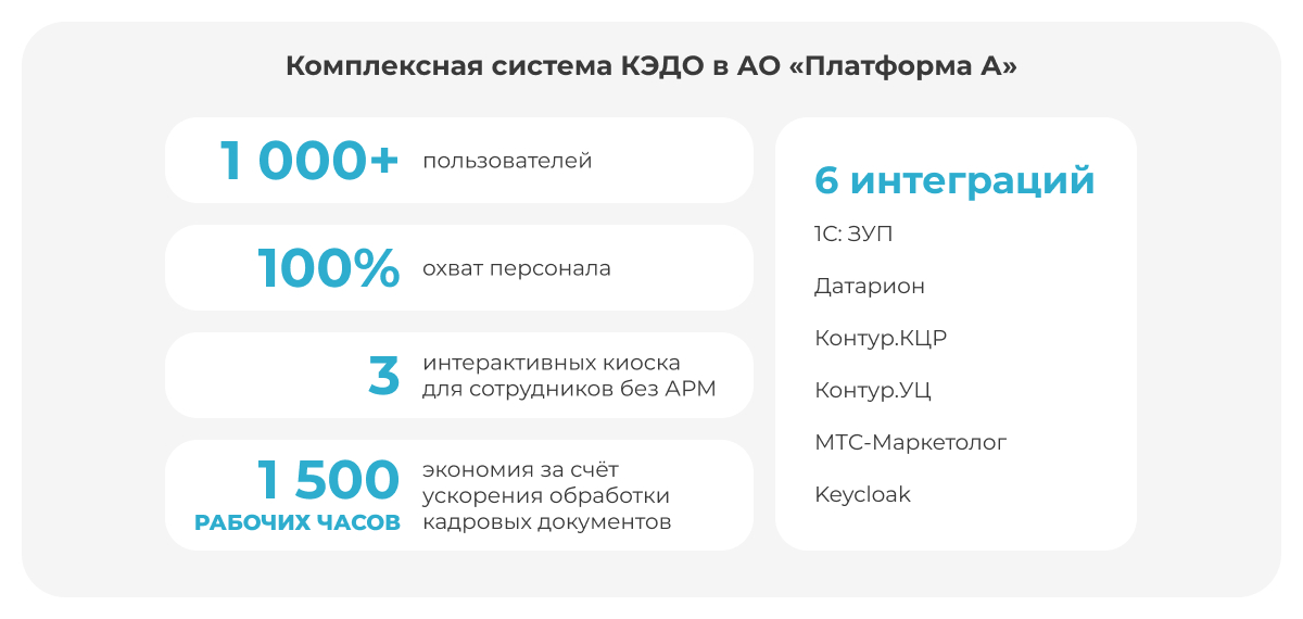 В результате внедрения КЭДО скорость обработки кадровых документов в АО «Платформа А» выросла в 2 раза.