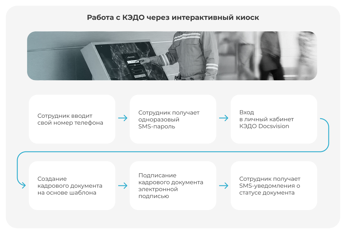 - После подтверждения согласия на выпуск электронной подписи сотрудник получает возможность подписывать документы в КЭДО Docsvision. Вход в личный кабинет КЭДО реализован в двух вариантах: с персонального компьютера (по постоянным логину и паролю) и через интерактивные киоски (по номеру телефона и одноразовому паролю). Первый вариант адресован сотрудникам с АРМ, второй – сотрудникам производственных подразделений.
